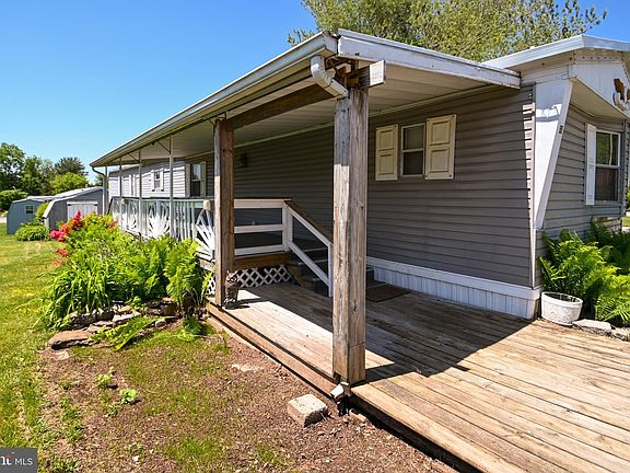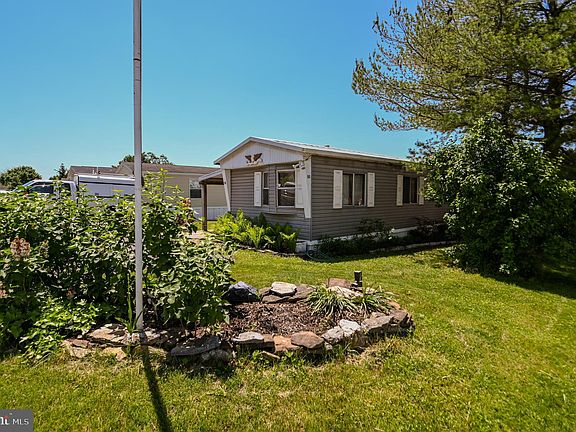 Enjoy economical one level living in this spacious 3 bed, 2 full bath home on a desirable corner lot in Chesapeake Estates! The pleasingly landscaped lot offers lovely flower gardens and mature foliage for shade and privacy, large paved parking pad and storage shed for your tools and toys. A huge covered deck frames the front entry, which reveals an open living room and eat-in kitchen with counter bar and bump out dining area, laundry room off the kitchen, and sun room addition with separate rear entrance. The primary suite is separated from the other bedrooms by the common living areas, and boasts French doors leading to a deluxe primary bath with soaking tub and walk-in shower. Two additional bedrooms and a full hall bath complete the home. Additional perks include a full complement of appliances, and convenient location in a small community surrounded by scenic rural landscapes, minutes to Morning Sun Market and Route 30, with easy access to York, Hanover & Gettysburg. Welcome home!