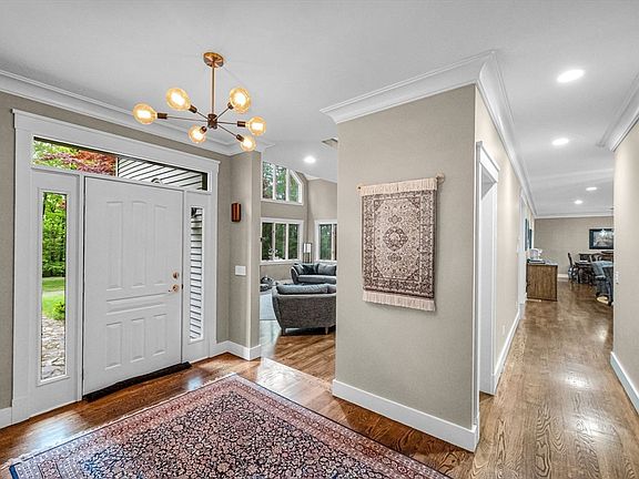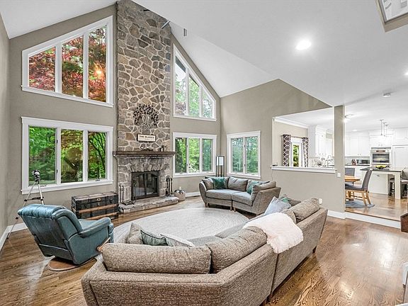 Vacation at home! Stunning hilltop retreat w/ soaring ceilings, modern updates & finishes. Gorgeous custom kitchen w/granite counters, expanded island, walk-in pantry. High-end appliances include Wolf range, Thermador fridge & Miele double ovens. Sunken living room has a two story fieldstone fireplace as its grand centerpiece. Hardwoods thru-out 1st floor plus crown molding & trims. Main level BR suite has full bath & unbelievable walk-in closet, a dream come true! 1st floor also includes a tremendous dining room/family room, laundry with storage cubbies & full shower bath. Mostly finished basement w/ office/guest room, 4th bath, media room, gym, workshop area & safe room/storage. 3 car garage has epoxy floor & walk-up storage. Recent yard expansion, fence added, screened porch, resurfaced deck, saltwater pool, newer patios & hot tub, play area, box garden & shed. Owned solar w/new inverter, pool pump & geo-thermal units May '24. Whole-house 22kW backup generator.