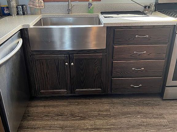 Remodel kitchen with oak cabinets and quartz countertops. All new laminate flooring in the lower part of home. Barn on site