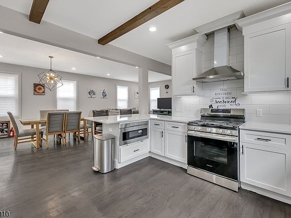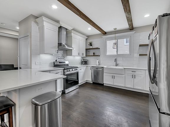 Beautifully modern 4-bedroom, 2.5-bath Colonial with stylish updates throughout. The kitchen features stainless steel appliances, a breakfast bar, soft-close custom cabinetry, under-cabinet lighting, and a beamed ceiling. The first floor offers gleaming hardwood floors, a spacious living room, and a dining room with sliding glass doors that open to a deep backyard, along with a full bathroom. Upstairs, four bedrooms and a modern bath complete the second level. The walk-up attic provides additional space for an office or playroom. The fully finished basement includes a recreation room, laundry area, and half bath. Additional highlights include a large two-car garage with plenty of parking, two-zone central heating and air conditioning, recessed lighting, refinished wood floors, and updated plumbing and electrical. Conveniently located near schools, shopping, dining, and transportation.