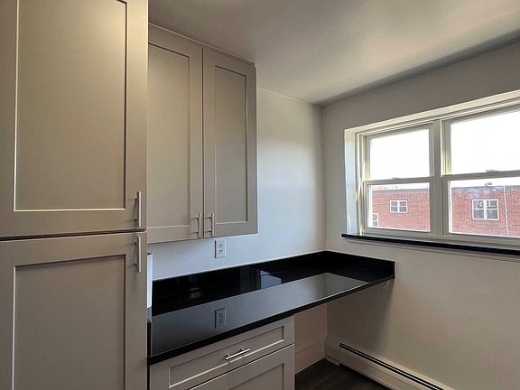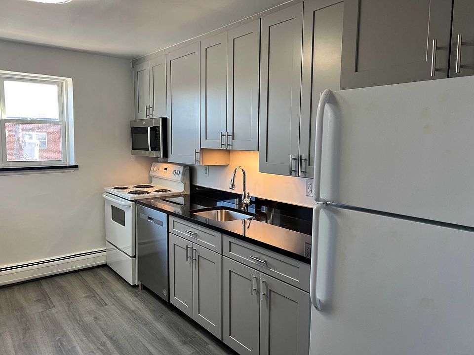 Just Renovated: NEW Kitchen and Bath. Spacious Top Floor Corner unit is drenched in sunlight. Granite counters in sleek Eat-in-Kitchen boasts dishwasher, disposal, microwave, refrigerator, electric range and two windows. Beautiful New Tiled Bath has a large shower and exhaust fan. Its large living room's picture window overlooks a professionally landscaped courtyard. It allows for flexible furniture layout including room for a pullout sofa bed and much more. The corner bedroom with tree top views will fit a king bedroom set easily. Refinished hardwood floors. Air Conditioning. Heat, Hot Water AND Parking at your back door, are all INCLUDED!. Laundry and seasonal Pool. NO FEE to tenant. Hurry before it's gone. NO FEE to renter if application is approved by 5/1. Heat/Hot Water and Parking are ALL INCLUDED.