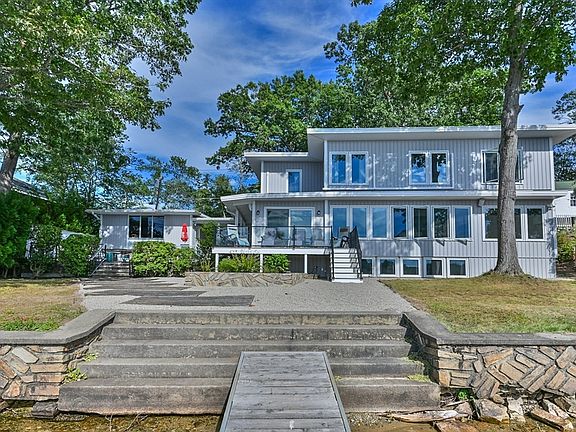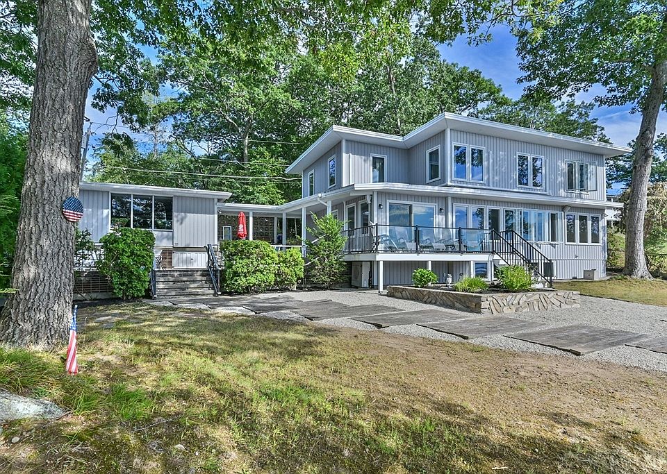 Stunning Webster Lake retreat on a rare flat lot w/100’ of pristine frontage & coveted western exposure for unforgettable sunsets on South Pond. Completely renovated w/luxury finishes, this home offers water views from every room. The open first floor features a gourmet kitchen w/quartz counters, custom cabinetry, & an oversized island, plus an office nook & efficient heating/cooling. A composite deck & expansive patio overlook the water, w/privacy enhanced by a detached 2-car garage & covered walkway. Upstairs, four spacious bedrooms include a spectacular primary suite w/walk-in closet, custom tiled shower. A secondary bath w/double vanity & second-floor laundry add convenience, while every bedroom captures lake views. The finished lower level offers additional living space, & an extra 5,436 sq ft rear lot with water access currently paved is great for overflow parking is included. A true one-of-a-kind lakefront property blending elegance, comfort, and natural beauty.