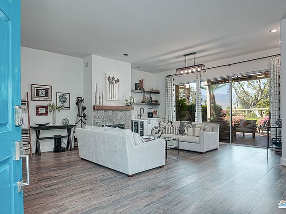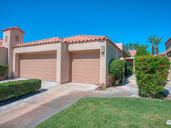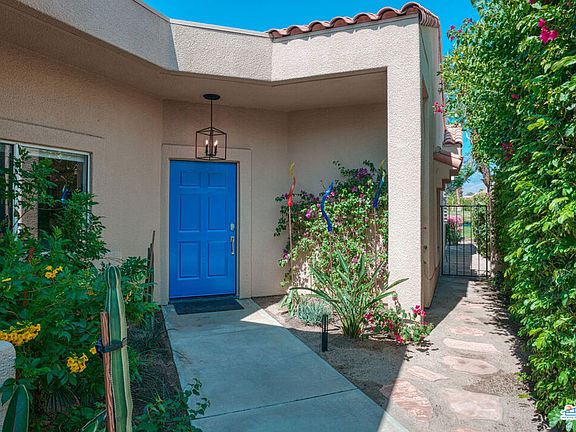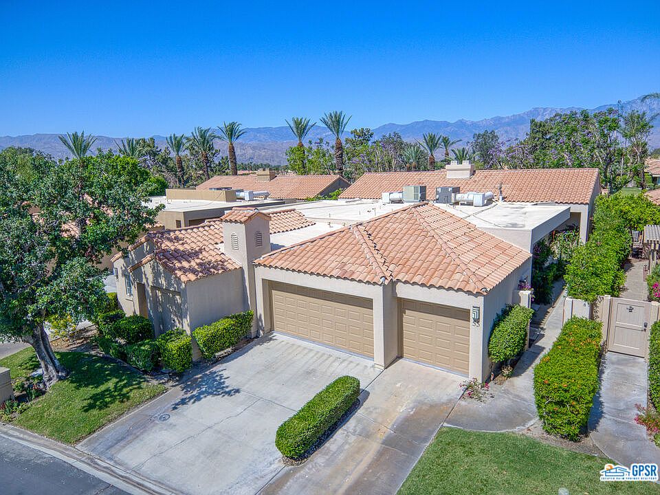 Welcome to this fully remodeled, turnkey furnished home on land that you own in Mission Hills Country Club. This move-in ready oasis combines the best in indoor and outdoor resort style living. Through the private gated courtyard the front door opens up to a stunning great room with nearly floor to ceiling windows framing lush landscape and huge mountain views. Tasteful, upscale finishes and optimization of the interior spaces are evident throughout. The great room features a spacious seating area by the fireplace, a wet bar with under counter refrigerator, a dining area, tons of wall space for your art collection, and those lush landscaping and breathtaking mountain views!! Guest bedroom one is off of the great room and makes for the perfect den if desired. Guest bed two has a three quarter bath with separate entry as a powder room. The primary suite with side courtyard access has room for a workspace and you'll love the very cleverly remodeled wall to wall closet! A spa like tub, twin vanities and a walk-in shower complete the primary suite. The large outdoor patio with covered and open spaces offers cozy seating, lounging and outdoor dining areas. From the patio, enjoy beautiful landscape and mountain views or take a very short walk to the nearby pool and spa. There is a two car garage plus a third stall for golf cart parking....and lots of built-in storage! Mission Hills East HOA fees include cable and internet, landscaping, guard gate, pools, spas, common area spaces, roof maintenance and exterior painting.