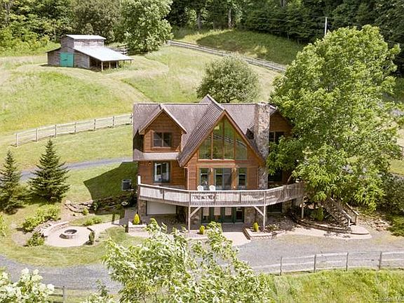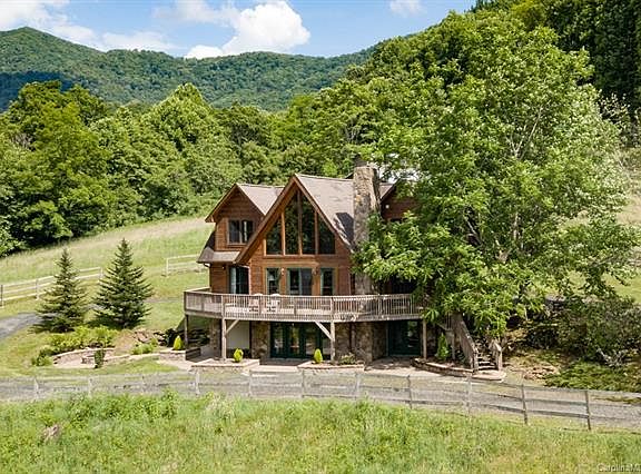 A rare treasure! 360° views, easy access, equestrian facilities and a generous cabin on over 3 acres. Sit in your rocker on the covered porch of this amazing mountain cabin and admire the two-story horse barn and pasture with majestic views as the backdrop, or lounge on the wrap-around deck, soaking in breath-taking mountain scenery while listening to the happy, noisy creek bounding along the lower edge of the property. Vaulted ceilings and eastern facing windows capture the sunrise over Roan Mountain, w/ fields and a small pond. MA bedroom on the main has a well proportioned full bath w/ a garden tub and separate shower. Downstairs, a spacious bonus area has extra bed space and a game room. Perfect as a primary or secondary home, this cabin has also been a popular short term rental for many years. 2018 heat pump, stained and sealed 2017 w/ Sikkens Stain, digital cable/internet; two wells; laundry in basement and 2nd set in MA walk-in closet; water heater 2017. Home warranty offered.
