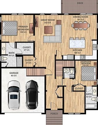 - Exterior features: Porch, Deck, Deck - Composite, Rain Gutters, Professional Landscaping
