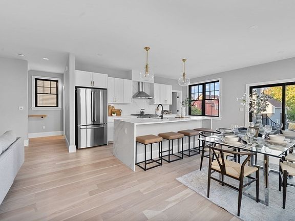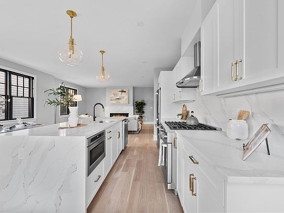 Welcome to 55 Derby Street, Unit 1. This exquisite duplex features sleek white oak floors, striking black-framed windows that provide abundant natural light, and a quartz-encased fireplace that adds warmth and elegance to the modern living space. The designer kitchen boasts top-of-the-line appliances and an expansive quartz island with waterfall edge. Adjacent to the kitchen, a charming dining area leads to a private deck for outdoor relaxation and a lush, grass backyard that is entirely fenced in. Downstairs, the primary bedroom suite features a spacious walk-in closet and luxurious double vanity bath, as well as two other generous bedrooms, each with en-suite bath. Located mere minutes from major dining, shopping, and entertainment options at Assembly Row, 55 Derby offers unparalleled convenience with easy access to I-93 and the Green/Orange line. Two tandem off-street parking spaces are included.