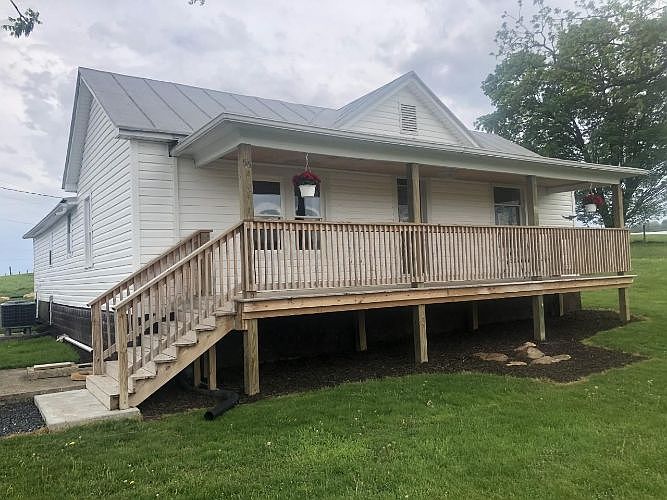 Country living at its finest! 1.1 Acre with views and a lovely remodeled Ranch. New flooring throughout. Kitchen just remodeled with new floors, cabinets, counter tops with eat at bar and breakfast area, walk in pantry! Metal roof just sealed and painted. Brand new Heat Pump and Central A C. Vinyl windows. Septic tank just inspected and pumped and new tops installed. Bathroom remodeled 3 years ago. Large laundry room with great storage space. Enjoy front porch sitting and views on the brand new covered front porch or spend your time in the backyard gardening and playing in the 32X40 garage with electric, gravel floor and flue. Hot water heater and pressure tank 5 years old. 200 AMP service