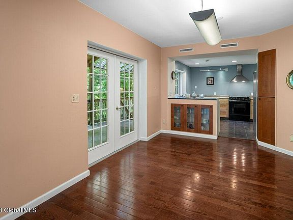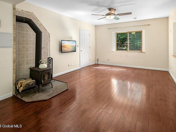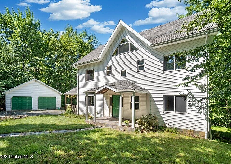 A super solid, cool and quiet home set in a leafy private location on a wooded lot on a desirable cul-de-sac, close to schools, library and stores with a delightful rural commute to Albany, Troy or Pittsfield. 5 large bright bedrooms, office and open plan living spaces have gorgeous hardwood floors. The mesmerizing foyer, modern kitchen, and 4 bathrooms are tiled. Stairs are newly carpeted. From the detached 2 car garage the side entrance porch leads through a mud room to the living area. The porch continues to the rear for summer chilling and grilling, accessed through the dining room French doors. The high, dry full basement includes laundry and sink and closets, additional storage can be found in the eves on the third floor. Comfortable radiant heat extends to the linen closet.