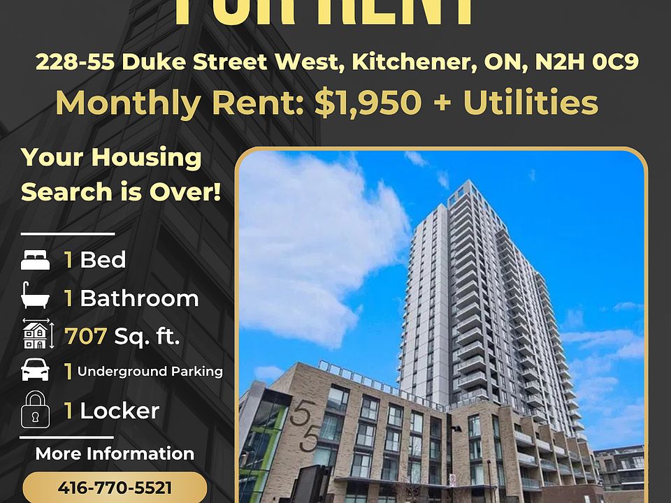 Address: 228-55 Duke Street West, Kitchener, ON, N2H 0C9Monthly Rent: $1,950 + UtilitiesAvailable: ImmediatelySquare Feet: 707Size: 1 Bed | 1 BathProperty Type: Condo ApartmentParking: IncludedLocker: Included