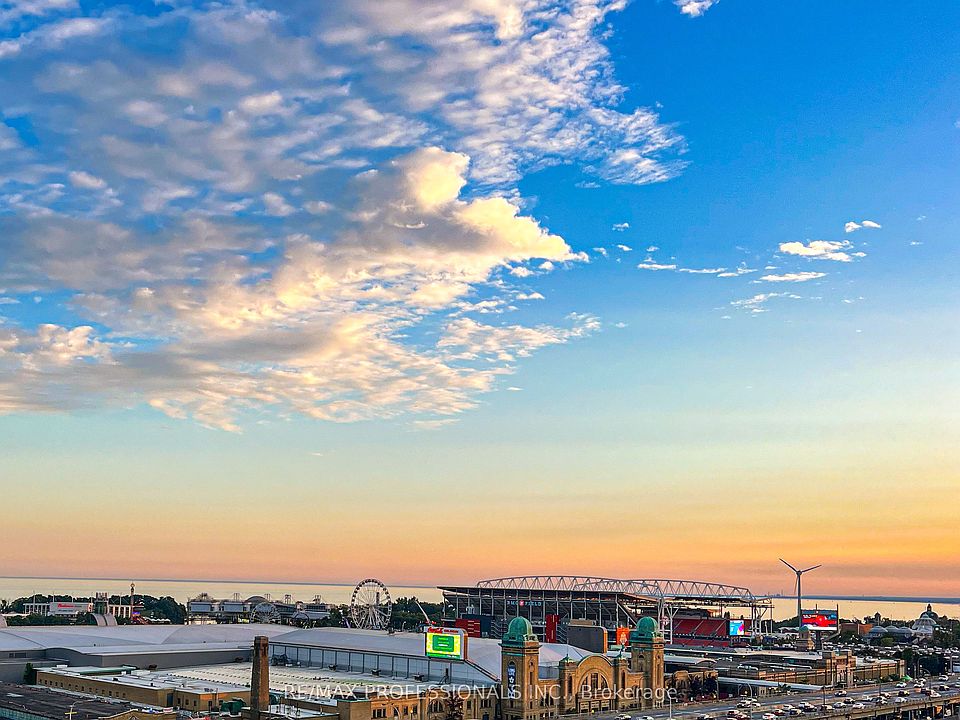 Welcome to urban living at its finest in Liberty Village! This beautifully renovated 1+1 bed, 2 bath condo offers 853 sq ft of bright, open-concept living across two stylish levels. Located in the vibrant Bliss Condos, this functional 2-storey loft features soaring floor-to-ceiling windows, high-end laminate flooring, and a private balcony with views of Lake Ontario, BMO Field, and breathtaking sunsets. Enjoy front-row seats to the FIFA World Cup, sporting events, the CNE, and more right from the comfort of home. The modern kitchen boasts quartz countertops, stainless steel appliances, undermount lighting, a waterfall island with seating, and plenty of storage. Upstairs, the spacious primary bedroom offers expansive windows with custom blackout roller shades, a double closet, and a private 3 pc ensuite. The spacious den is perfect for a home office, reading nook, or creative space. Parking & locker included. Enjoy premium building amenities including a gym, indoor pool and hot tub, sauna, outdoor terrace, party room, 24 hr concierge, and more. Steps to TTC, GO Station, trendy shops, restaurants, bars, parks, and scenic waterfront trails. Offering the perfect blend of style, comfort, and unbeatable views, this one has it all!