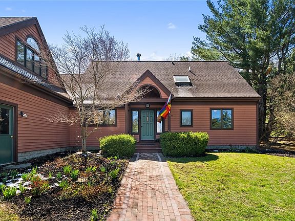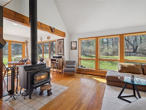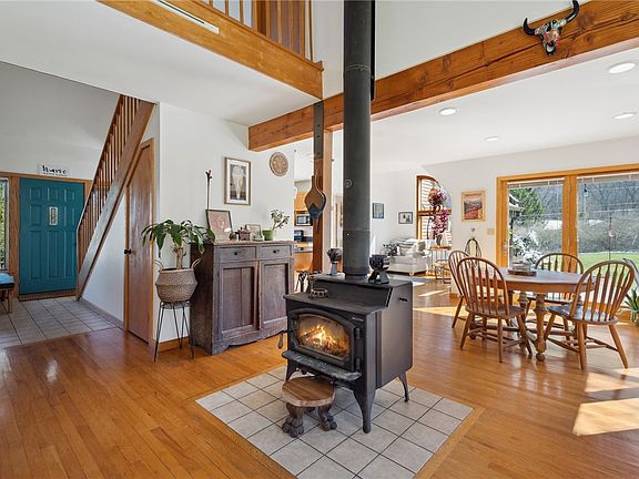 This charming 4-bedroom, 2-bath home blends comfort, quality, and natural beauty. Fresh paint and new hardwood floors upstairs add modern appeal, while stunning windows bathe the space in natural light—even on cloudy days. The open-concept layout features a spacious kitchen with ample storage, handmade cabinets, and a custom vanity. Cozy up by the wood stove or enjoy the impressive rec room above the garage—perfect for hobbies, entertaining, or extra living space. Generously sized bedrooms offer plenty of room to relax. Step outside to an expansive, private yard with mature trees, beautiful landscaping, and a fantastic back deck ideal for gatherings. Located minutes from Cornell, downtown Ithaca, and Ithaca College, with easy access to Bell Sherman. High-performance windows and thoughtful construction ensure year-round comfort. Tucked close to nature, where birdsong fills the air and traffic noise is a distant memory, this home is truly a peaceful retreat.
