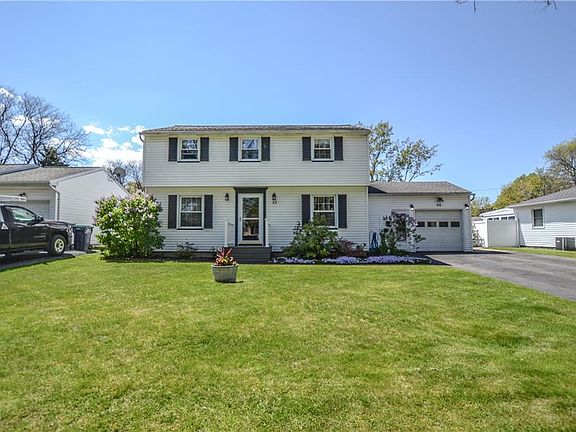 Mr. & Mrs. Clean have meticulously maintained this 3 bedroom, 1.5 bath East Irondequoit Colonial for 20+ years & it shows!!! This 1,600+ square foot vinyl sided home has incredible mechanics! Tear-off roof approximately 8-9 yrs young, 3 yr young high efficiency Heil furnace & central air (just serviced too!), 1 yr young h2o heater, glass block windows, & thermopane windows throughout! The 1st floor features two large living spaces, a large formal dining room, and beautifully updated kitchen. The kitchen features granite counters, included stainless steel appliances, oak cabinetry, tile backsplash, huge walk-in pantry, and laminate flooring! Upstairs there are 3 nice sized bedrooms including the master bedroom which has 2 spacious closets! The fully fenced backyard is like an outdoor oasis with impeccable landscaping and features a built in fire-pit, hot tub, shed, and concrete patio! It's believed that there are natural hardwood floors under the carpeting in the formal dining room & living room downstairs! Location is prime, close to Eastridge High School, 104, Ridge/Culver Plaza, Wegmans, & more! Delayed Showings 5-20 and end on 5-23. Negotiations begin on 5-24 at 12PM!