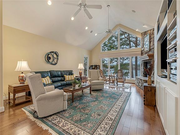 This magnificent custom lake home offers meticulous attention to detail. Open the door and you will be immediately greeted by unobstructed lake views! Water is everywhere! Generously sized windows frame incredible water views. This home has an exceptionally well designed floor plan. Custom details, built-in cabinetry, large picture windows and hardwood floors can be found throughout the home. The foyer opens up into the dining room and great room which is accented by a soaring vaulted ceiling and a warm stone fireplace with a ledge for sitting by the cozy fire. There is a centrally located wet bar between the kitchen and great room featuring glass doors, an ice maker and a bar refrigerator. The kitchen is perfect for both large-scale entertaining and fun-filled family gatherings. Rich custom maple cabinetry, Quartzite counter tops, Stainless Steel appliances, designer tile, a modern sink, built-in desk area and a walk-in pantry are just a few of the fantastic features in this modern kitchen. Sliding glass doors from the kitchen lead out to the large outdoor upper entertaining deck. The master retreat features a lovely tray ceiling with large windows to admire the lake views. A lavish master bath features a dramatic vaulted tongue and groove ceiling, his/her vanities, a Jacuzzi tub, walk-in designer glass shower and a very spacious walk-in closet. There is a large office on the main level with pullout drawers and large shelves. Even the office has a lake view! The terrace level features a large recreation room, two guest suites, two full baths, a craft room, laundry room and a workshop. Plenty of storage. Lots of outdoor spaces to enjoy in this wonderful lake home. There is a lower level deck with a hot tub and a covered flagstone patio that is adjacent to the tranquil waterfall. Glorious sun sets can be enjoyed sitting in these special outdoor areas. Thoughtful extras include an irrigation system that draws from the lake, outdoor lighting, well designed landscaping with stunning flowers blooming for every season and so much more. Ultimate privacy can be found on this rare .90 acre waterfront home on the south side of Keowee Key. Low maintenance home with HardiePlank siding and very energy efficient. 55 Gulf Stream Lane offers the perfect place to begin building a lifetime of Lake Keowee memories. A true treasure!