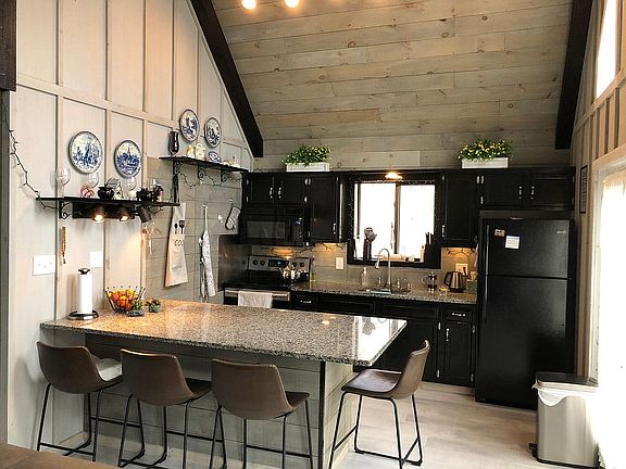 Click on the video tab in photos so you can take a tour of this completely redone Chalet in the community of Thornhurst County Club Estates. This 3 bedroom, 2 bath Chalet has a brick wood burning fireplace in the living room. The living room has cathedral wood ceilings and french doors to the deck. The kitchen has a large eating island and granite counter tops. Home has ductless AC and heating system, an emergency propane heating system, an industrial ceiling fan, water resistant laminate flooring throughout, a retractable patio awning, an encapsulated crawlspace that can be used for storage, a waterfall shower in the master bathroom, a fire pit in the yard and so much more. Home is on public water and sewer. Owner pays $125/month for both. Video surveillance on property.