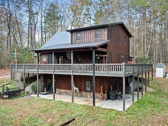 Only minutes to Blue Ridge this Peaceful mountain retreat on 2.42 private acres offers a park-like setting with a beautiful lawn and a cozy outdoor fire pit perfect for cool mountain evenings. Located in a pristine neighborhood with paved streets and public water available, this property is ideal for personal use or investment. The land features a gentle, rolling slope with an outdoor utility shed, and is adorned with cabin-style wood siding and cedar shake accents. The main level boasts expansive decks and covered porches that wrap around the home, inviting relaxation and outdoor enjoyment. Inside, you'll find luxury vinyl plank flooring, soaring pine ceilings, and a large stone fireplace in the great room, creating a warm and open atmosphere. The kitchen is a true highlight, featuring a farmhouse sink, custom cabinetry, tile countertops, and stainless steel appliances. Off the kitchen, there's a convenient laundry area with access to outdoor porches and a two-bay carport. The main-level primary suite offers a spacious bath with a double vanity and walk-in shower. Upstairs, a versatile loft/office area with a powder room complements a second master en-suite, complete with a full bath and a generous walk-in closet. The terrace level extends the living space with a third bedroom, bath, utility room, and a spacious living/recreation room with 9-foot rustic metal ceilings. This level opens to a concrete porch on two sides, enhancing outdoor options. With an additional building lot included in the acreage, this property offers room to grow and endless possibilities. Embrace mountain living at its finest in this tranquil, versatile home.
