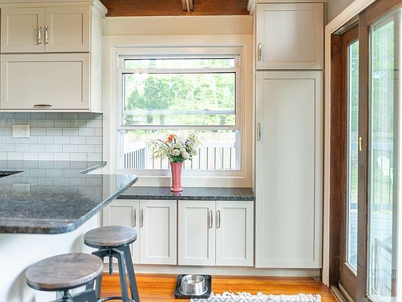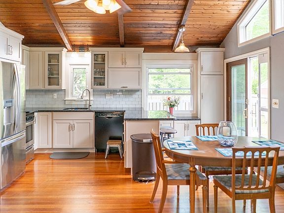 Near Lakeside Living at it's Finest. Enjoy sun splashed rooms with a lofty cathedral ceiling and windows designed to maximize style and daylight in an appealing open floor plan. The first floor has beautiful antique hardwood floors. The kitchen is the heart of the home with granite counters and SS appliances, subway tile backsplash and modern cabinetry. Double doors open to an expansive deck and a large fully fenced in back yard. The deck has natural gas plumbed for your grill! Enjoy from both kitchen and living room the gas Jotul stove nestled into a brick fireplace adding warmth and ambiance as well as keeping utility bills lower. Two well sized bedrooms are down the hall. The lower level was recently finished as an office and two additional convenient living spaces plus storage and laundry area. As you approach the house there is an area of land that has potential to be used for your boat/extra car or could be landscaped any way you imagine. Johns Pond area! Welcome home