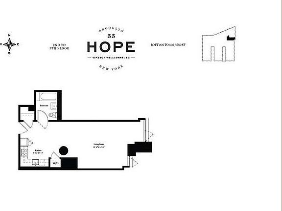 Over-sized studio measuring 550 SF . A converted pencil factory, 55 Hope is a timeless nod to mid-20th century Brooklyn. Featuring unique loft living in a synthesis of classic architecture and modern amenities, residents can enjoy the sophistication of years past with the convenience of today. Carefully crafted interiors were created to highlight the original features of the building, including soaring, exposed concrete ceilings and large windows that frame the classic urban and Manhattan views. Wide plank oak floors, 8 foot solid core doors, white glass counter tops, imported Italian chef's kitchens with stainless steel appliances, Kohler fixtures and spa-like bathrooms with Zuma soaking tubs, Toto toilets and washer/dryers add a clean elegance to the charm of the warehouse details retained. Several units also feature home office spaces. 55 Hope is not just a place to live it's a lifestyle chosen by the discerning renter seeking distinct NY loft living with an elevated twist. Residents and guests are welcomed by a dramatic lobby lounge surrounded by bamboo gardens. Elevators grant residents ease of access to their lofts and the 8,500 SF landscaped roof deck offering panoramic views and opportunities to soak in the rays or relax with some outdoor yoga. A state of the art fitness center allows residents to stay fit. A virtual doorman and resident superintendent offer security without sacrificing privacy. Bicycles and all other items may be stored in one of the many dedicated private storage spaces. Located in the midst of modish, New York City lifestyle, 55 Hope is within close proximity to four public playgrounds, three community gardens and some of Williamsburg's best known parks, including McCarren Park, which is popular for its concerts, festivals and pool. Dozens of Zagat-rated restaurants decorate the neighborhoods. While it's difficult to imagine running out of spots to try in the neighborhood, the G (Metropolitan Ave) and L (Lorimer St) trains are each 3 blocks away, with the J, M, Z (Marcy Ave) station just a few blocks further.