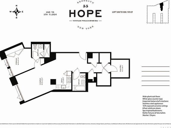 Featuring unique loft living in a synthesis of classic architecture and modern amenities, residents can enjoy the sophistication of years past with the convenience of today. Carefully crafted interiors were created to highlight the original features of the building, including soaring, exposed concrete ceilings and large windows that frame the classic urban and Manhattan views. Wide plank oak floors, 8 foot solid core doors, white glass counter tops, imported Italian chef''s kitchens with stainless steel appliances, Kohler fixtures and spa-like bathrooms with Zuma soaking tubs, Toto toilets and washer/dryers add a clean elegance to the charm of the warehouse details retained. Several units also feature home office spaces. elevated twist.