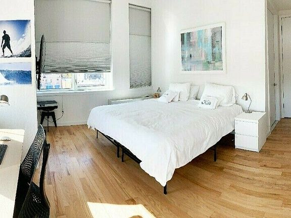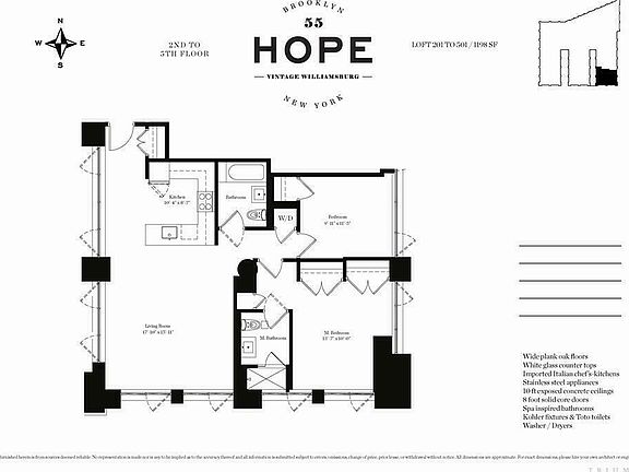Corner 2 bed 2 bath with spacious open kitchen layout in converted pencil factory. 55 Hope is a timeless nod to mid-20th century Brooklyn. Featuring unique loft living in a synthesis of classic architecture and modern amenities, residents can enjoy the sophistication of years past with the convenience of today. Carefully crafted interiors were created to highlight the original features of the building, including soaring, exposed concrete ceilings and large windows that frame the classic urban and Manhattan views. Wide plank oak floors, 8 foot solid core doors, white glass counter tops, imported Italian chef''s kitchens with stainless steel appliances, Kohler fixtures and spa-like bathrooms with Zuma soaking tubs, Toto toilets and washer/dryers add a clean elegance to the charm of the warehouse details retained. Several units also feature home office spaces. 55 Hope is not just a place to live it's a lifestyle chosen by the discerning renter seeking distinct NY loft living with an elevated twist. Residents and guests are welcomed by a dramatic lobby lounge surrounded by bamboo gardens. Elevators grant residents ease of access to their lofts and the 8,500 SF landscaped roof deck offering panoramic views and opportunities to soak in the rays or relax with some outdoor yoga. A state of the art fitness center allows residents to stay fit. A virtual doorman and resident superintendent offer security without sacrificing privacy. Bicycles and all other items may be stored in one of the many dedicated private storage spaces. Located in the midst of modish, New York City lifestyle, 55 Hope is within close proximity to four public playgrounds, three community gardens and some of Williamsburg's best known parks, including McCarren Park, which is popular for its concerts and festivals. While it's difficult to imagine running out of spots to try in the neighborhood, the G (Metropolitan Ave) and L (Lorimer St) trains are each 3 blocks away, with the J, M, Z (Marcy Ave) station just a few blocks further.