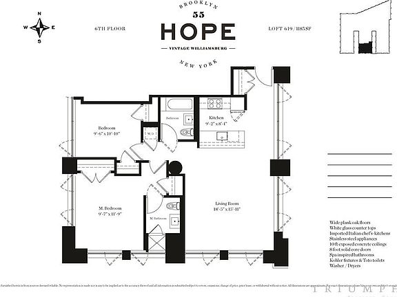 55 Hope is a timeless nod to mid-20th century Brooklyn. Featuring unique loft living in a synthesis of classic architecture and modern amenities, residents can enjoy the sophistication of years past with the convenience of today. Carefully crafted interiors were created to highlight the original features of the building, including soaring, exposed concrete ceilings and large windows that frame the classic urban and Manhattan views. Wide plank oak floors, 8 foot solid core doors, white glass counter tops, imported Italian chef''s kitchens with stainless steel appliances, Kohler fixtures and spa-like bathrooms with Zuma soaking tubs, Toto toilets and washer/dryers add a clean elegance to the charm of the warehouse details retained. Several units also feature home office spaces. 55 Hope is not just a place to live its a lifestyle chosen by the discerning renter seeking distinct NY loft living with an elevated twist. Residents and guests are welcomed by a dramatic lobby lounge surrounded by bamboo gardens. Elevators grant residents ease of access to their lofts and the 8,500 SF landscaped roof deck offering panoramic views and opportunities to soak in the rays or relax with some outdoor yoga. A state of the art fitness center allows residents to stay fit. A virtual doorman and resident superintendent offer security without sacrificing privacy. Bicycles and all other items may be stored in one of the many dedicated private storage spaces. Located in the midst of modish, New York City lifestyle, 55 Hope is within close proximity to four public playgrounds, three community gardens and some of Williamsburgs best known parks, including McCarren Park, which is popular for its concerts, festivals and pool. Dozens of Zagat-rated restaurants decorate the neighborhood . While its difficult to imagine running out of spots to try in the neighborhood, the G (Metropolitan Ave) and L (Lorimer St) trains are each 3 blocks away, with the J, M, Z (Marcy Ave) station just a few blocks further. Please note, floor plan is of an identical layout on the sixth floor