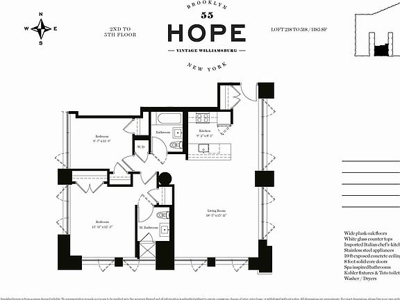 Sunny PENTHOUSE 2 Bed 2 Bath with in-unit washer and dryer combo. Complimentary access to gym and shared roof deck. 5 Hope is a timeless nod to mid-20th century Brooklyn. Featuring unique loft living in a synthesis of classic architecture and modern amenities, residents can enjoy the sophistication of years past with the convenience of today. Carefully crafted interiors were created to highlight the original features of the building, including soaring, exposed concrete ceilings and large windows that frame the classic urban and Manhattan views. Wide plank oak floors, 8 foot solid core doors, white glass counter tops, imported Italian chef's kitchens with stainless steel appliances, Kohler fixtures and spa-like bathrooms with Zuma soaking tubs, Toto toilets and washer/dryers add a clean elegance to the charm of the warehouse details retained. 55 Hope is not just a place to live its a lifestyle chosen by the discerning renter seeking distinct NY loft living with an elevated twist. Residents and guests are welcomed by a dramatic lobby lounge surrounded by bamboo gardens. Elevators grant residents ease of access to their lofts and the 8,500 SF landscaped roof deck offering panoramic views and opportunities to soak in the rays or relax with some outdoor yoga. A state of the art fitness center allows residents to stay fit. A virtual doorman and resident superintendent offer security without sacrificing privacy. Bicycles and all other items may be stored in one of the many dedicated private storage spaces. Located in the midst of modish, New York City lifestyle, 55 Hope is within close proximity to four public playgrounds, three community gardens and some of Williamsburgs best known parks, including McCarren Park, which is popular for its concerts, festivals and pool. Dozens of Zagat-rated restaurants decorate the neighborhood. While its difficult to imagine running out of spots to try in the neighborhood, the G (Metropolitan Ave) and L (Lorimer St) trains are each 3 blocks away, with the J, M, Z (Marcy Ave) station just a few blocks further. **Photos coming soon"