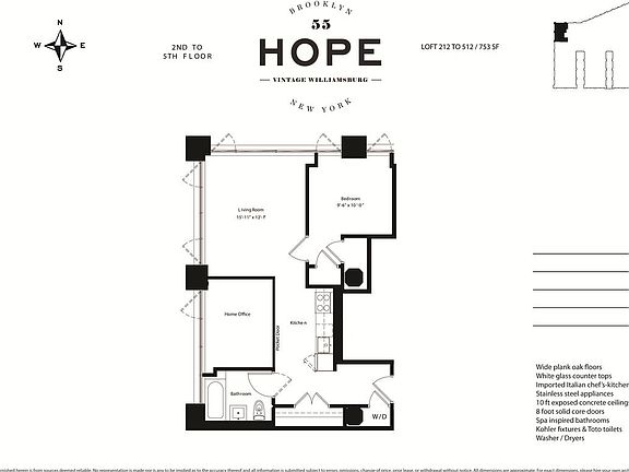 If you have to work from home, this penthouse one bedroom plus windowed home office is the place to shelter. Featuring unique loft living in a synthesis of classic architecture and modern amenities, residents can enjoy the sophistication of years past with the convenience of today. Carefully crafted interiors were created to highlight the original features of the building, including soaring, exposed concrete ceilings and large windows that frame the classic urban and Manhattan views. Wide plank oak floors, 8 foot solid core doors, white glass counter tops, imported Italian chef''s kitchens with stainless steel appliances, Kohler fixtures and spa-like bathrooms with Zuma soaking tubs, Toto toilets and washer/dryers add a clean elegance to the charm of the warehouse details retained.
