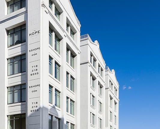 Stylish penthouse studio at 55 Hope is a timeless nod to mid-20th century Brooklyn. Featuring unique loft living in a synthesis of classic architecture and modern amenities, residents can enjoy the sophistication of years past with the convenience of today. Carefully crafted interiors were created to highlight the original features of the building, including soaring, exposed concrete ceilings and large windows that frame the classic urban and Manhattan views. Wide plank oak floors, 8 foot solid core doors, white glass counter tops, imported Italian chef''s kitchens with stainless steel appliances, Kohler fixtures and spa-like bathrooms with Zuma soaking tubs, Toto toilets and washer/dryers add a clean elegance to the charm of the warehouse details retained. Several units also feature home office spaces. 55 Hope is not just a place to live its a lifestyle chosen by the discerning renter seeking distinct NY loft living with an elevated twist. Residents and guests are welcomed by a dramatic lobby lounge surrounded by bamboo gardens. Elevators grant residents ease of access to their lofts and the 8,500 SF landscaped roof deck offering panoramic views and opportunities to soak in the rays or relax with some outdoor yoga. A state of the art fitness center allows residents to stay fit. A virtual doorman and resident superintendent offer security without sacrificing privacy. Bicycles and all other items may be stored in one of the many dedicated private storage spaces. Located in the midst of modish, New York City lifestyle, 55 Hope is within close proximity to four public playgrounds, three community gardens and some of Williamsburgs best known parks, including McCarren Park, which is popular for its concerts and festivals. Dozens of Zagat-rated restaurants decorate the neighborhood. While its difficult to imagine running out of spots to try in the neighborhood, the G (Metropolitan Ave) and L (Lorimer St) trains are each 3 blocks away, with the J, M, Z (Marcy Ave) station just a few blocks further. *Photos are of a model unit.