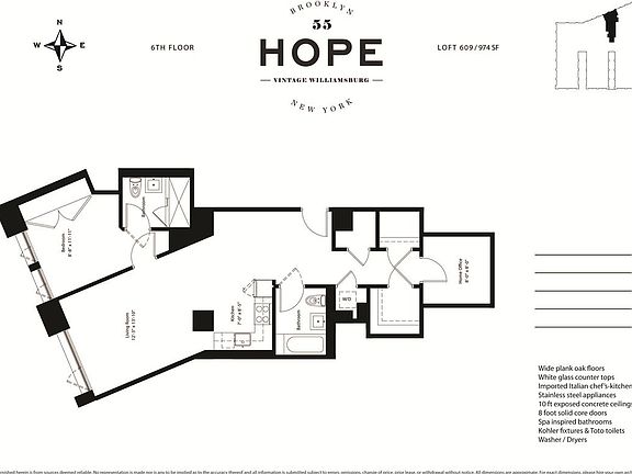 980SF one plus home office with 2 full bathrooms and neighborhood view. **Photos are of a model apartment; see floor plan and 3D video tour of similar apartment** 55 Hope is a timeless nod to mid-20th century Brooklyn. Featuring unique loft living in a synthesis of classic architecture and modern amenities, residents can enjoy the sophistication of years past with the convenience of today. Carefully crafted interiors were created to highlight the original features of the building, including soaring, exposed concrete ceilings and large windows that frame the classic urban and Manhattan views. Wide plank oak floors, 8 foot solid core doors, white glass counter tops, imported Italian chef''s kitchens with stainless steel appliances, Kohler fixtures and spa-like bathrooms with Zuma soaking tubs, Toto toilets and washer/dryers add a clean elegance to the charm of the warehouse details retained. Several units also feature home office spaces. 55 Hope is not just a place to live it's a lifestyle chosen by the discerning renter seeking distinct NY loft living with an elevated twist. Residents and guests are welcomed by a dramatic lobby lounge surrounded by bamboo gardens. Elevators grant residents ease of access to their lofts and the 8,500 SF landscaped roof deck offering panoramic views and opportunities to soak in the rays or relax with some outdoor yoga. A state of the art fitness center allows residents to stay fit. Bicycles and all other items may be stored in one of the many dedicated private storage spaces. Located in the midst of modish, New York City lifestyle, 55 Hope is within close proximity to four public playgrounds, three community gardens and some of Williamsburg's best known parks, including McCarren Park, which is popular for its concerts and festivals. Dozens of Zagat-rated restaurants decorate the neighborhood While it's difficult to imagine running out of spots to try in the neighborhood, the G (Metropolitan Ave) and L (Lorimer St) trains are each 3 blocks away, with the J, M, Z (Marcy Ave) station just a few blocks further. **Photos are of model units. Please check out the floor plans.**