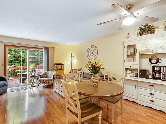 You will see how lovingly maintained this unit has been kept as soon as you enter through the front door! On the first level is the fully renovated and modern kitchen offering newer SS appliances, custom cabinetry, granite countertops, tile backsplash, and tile flooring. The service window allows for additional light to shine through while you prepare your morning coffee. Off of the entryway is a conveniently located powder room. This unit boasts gleaming engineered hardwood throughout the living room and upstairs bedrooms with tasteful paint colors. The living room and dining room area is plenty spacious for your gathering needs. There is a slider off of the living room to your own well-kept deck and outdoor space facing a wooded area for privacy. There are newer Harvey vinyl windows and blinds. This location offers walking trails and abundant green space! Upstairs you will find two sizeable bedrooms and a full bathroom. There is ample closet space for your storage needs. One of the big draws to these units is the fact that they offer a full basement. This one is fantastic, finished storage space for all of your recreational and hobby needs. This is where the laundry room is located, as well as your utilities. The on-demand boiler was installed 2017 and just serviced in 2024. Lastly, it offers a detached 1-car garage. Showings begin Thursday 3/21