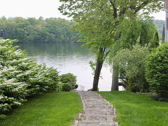 Waterfront patioDirect waterfront accessStone staircasePerennial gardensLit-up lamp postsThree bathNewly installed hardwood floors