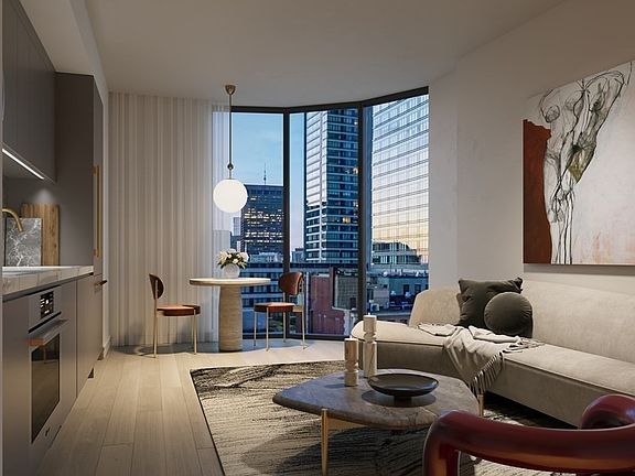 The Parker is a luxury condominium building in the heart of the Theater District, featuring 168 articulately designed studios, one bedroom, and two-bedroom penthouse residences. Centrally located, it offers a 24-hour concierge and doorman with speakeasy-inspired amenities by Zarifi Design. Amenities include a cocktail lounge, billiards room, and private screening room, and are rounded out by a state-of-the-art fitness center and a roof deck perched atop Boston Common with spectacular views of the Back Bay, sunsets over the Charles River, and Financial District. Residences feature a clean design with unexpected details such as sculptural floor-to-ceiling windows and wide-plank white oak flooring. The kitchen boasts a custom Italian marble backsplash with brass finishes and a rich color palette combining materials and textures to create a sleek, dynamic aesthetic. Each layout is efficiently designed to cater to the modern city dweller and offers residents an exclusive lifestyle.