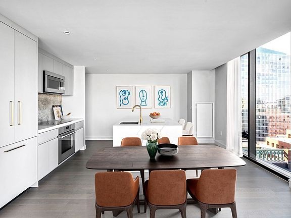 Immediate occupancy. The Parker is a luxury condominium building in the Theater District, featuring 168 articulately designed studios, one bedroom, and two-bedroom penthouse residences. Centrally located, it offers a 24-hour concierge with speakeasy-inspired indoor and outdoor amenities by Zarifi Design. Residences feature a clean design with unexpected details such as sculptural floor-to-ceiling windows and wide-plank white oak flooring. The kitchen boasts a custom Italian marble backsplash with brass finishes and a rich color palette combining materials and textures to create a sleek, dynamic aesthetic. Amenities include a cocktail lounge, billiards room, private screening room, co-working space and are rounded out by a state-of-the-art fitness center and a roof deck perched atop Boston Common with spectacular views of the Back Bay, sunsets over the Charles River, and Financial District.