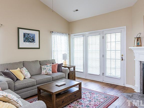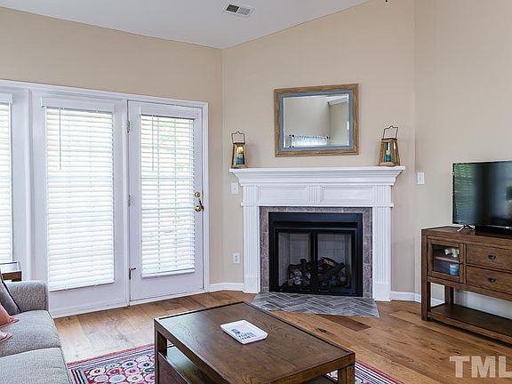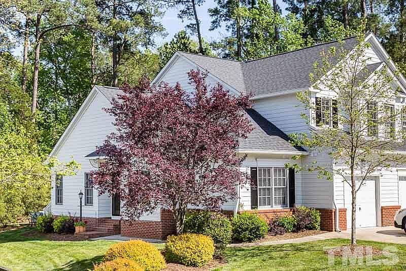 EASY LIVING, LOW MAINTENANCE, STYLISH TOWNHOME! Light-filled, end unit with soaring ceilings. Easy-access FIRST FLOOR MASTER. Open-flow contiguous LR/DR with gas FP. User-friendly kitchen with 2017 SS APPLIANCES. 2017 roof. Garage. Relaxation & play space on 12x12 PATIO and grassy yard. Prime location bordered by tall trees, steps from walking trails. Picturesque lake, pool, playground, fitness center add to the list of community pluses. Mins from RTP, RDU & Southpoint Mall. A GREAT FIND!