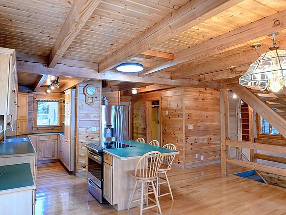 Maine lakefront log home for sale in Lincoln, Maine on Upper Cold Stream Pond. The first floor features a kitchen with a island, dining room, living room, and a full bathroom w/ laundry hookup. The second floor features a full bathroom w/ a jetted tub, and 2 large bedrooms both with walk-in closets. The daylight basement is finished with a family room, bedroom, full bathroom, and a utility room. This home has power, private well, private septic, generator hookup, and is located on a year round road. There is an attached 2 car garage with storage above. Relax and enjoy the loons and the beautiful views from the wrap around deck and covered porch that overlook the water. Recreational activities include swimming, kayaking, boating, fishing, snowmobiling, and ATVing all directly from this property. Close to Lincoln where you will find shopping, restaurants, hospital, and other amenities.