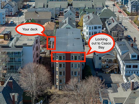 Enjoy stunning year round views of Casco Bay from this top floor unit. You will also enjoy looking at one of the largest private gardens in Portland sandwiched between the building and the Eastern Promenade. This is a bright, sunny unit with windows on all three sides. Historical details include wainscoting, bay windows, a built in hutch, large pantry, and original hardwood floors. Enjoy morning coffee on your private deck. Association laundry and generous basement storage. This is a secure building and well-run condo association. Step out of the building to the Eastern Promenade Park with its 78 acres of trails and year-round enjoyment including the East End Beach just one block away. Restaurants and Rosemont Market are also close by. This is a rare opportunity to own on beautiful Morning Street with one-of-a-kind views and privacy.