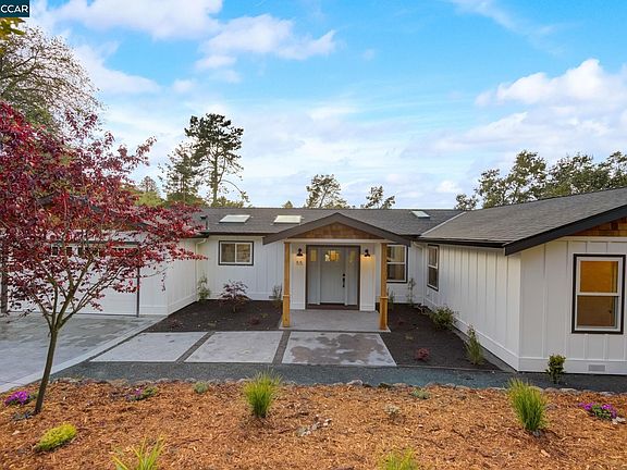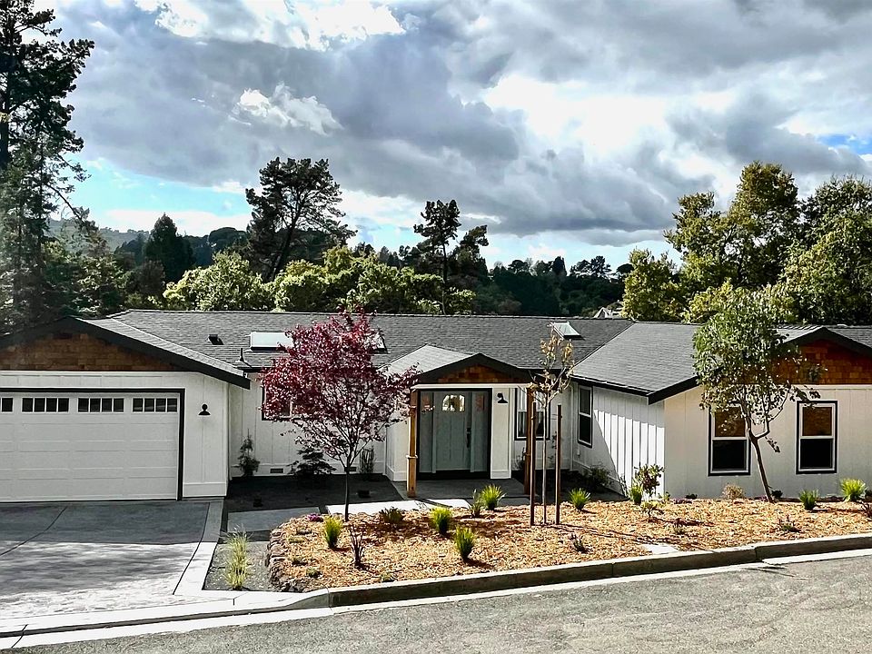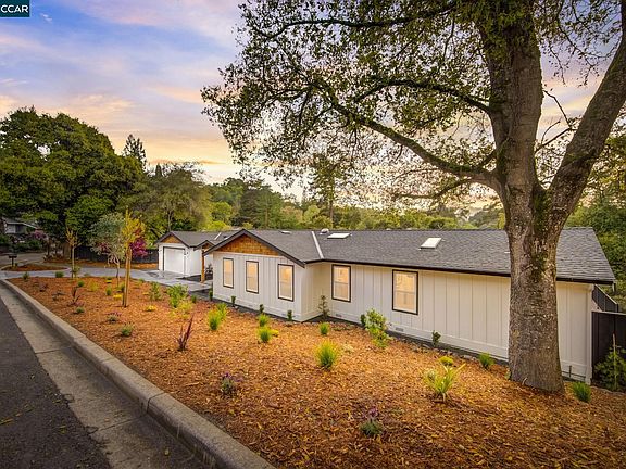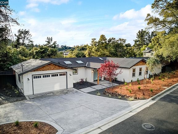 Expanded & totally reinvented Glorietta home offers gracious open living spaces, fabulous outdoor entertaining and play, & exceptional views. Light pours into the 3243 square foot home through 8 sky lights, 4 Solar Tubes, and large dual-paned windows & 4 large sliders. Great room on main level has grand vaulted ceiling, and 2 large sliders opening to the sunset deck, covered outdoor bar & lounge, and Western view beyond. Kitchen features white cabinetry, stainless appliances, incl. 36” gas range, & large 4 seat island w/ waterfall quartz counters. Adjacent dining room has built-in buffet w/ wine fridge. 4 bedrooms on entry level are all en-suite, including spa-like primary w/ private deck, luxurious shower & separate soaking tub. Downstairs, there is a large family room + bedroom & full bath adjacent. Family room opens to newly laid soccer-ready lawn. Circular drive leads to 2-car garage finished w/ sheetrock, epoxy floor, new lighting, EV charging, and 8 ft door for tall vehicles. The mostly white exterior is clad in stylish board & batten, made of durable & fire-safe Hardie siding, & accented w/ cedar shingles & posts for warmth & contrast. Close-to-town - just minutes to the highway and BART in Orinda.