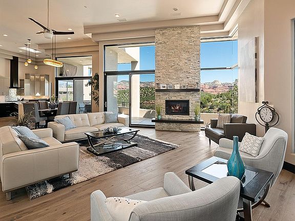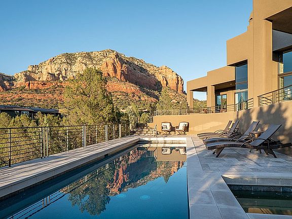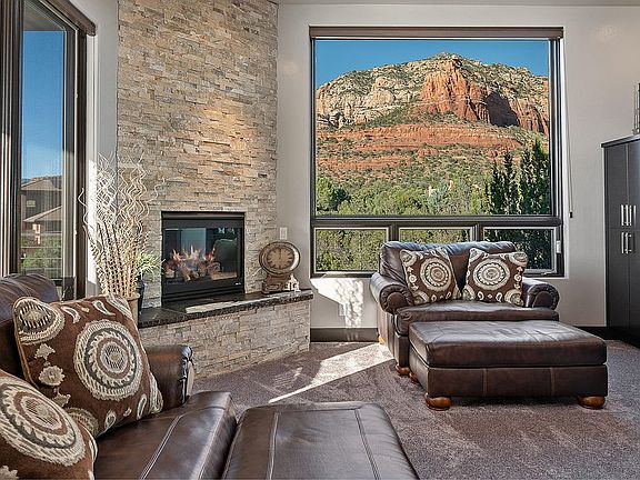 Stunning views and a perfect home for the Sedona indoor - outdoor life style. Looking into National Forest on a quiet cul-de-sac and with truly stunning close up Red Rock and distant views from every room, it is securely located on 2 acres in one of Sedona's premier gated communities. Built by John Mullis it has been brought to life by a complete and comprehensive remodel in 2019 and upgrades in 2020/21. Beautiful and extraordinary finishes bring a very tasteful and contemporary touch to the home. Major systems haven been replaced or upgraded - see list below. Single level with some of the guest bedrooms on split level, it offers 5 bedrooms, three of which are en-suite, including the spacious master suite with fire place and sitting area; living room open to dining and the state of the art