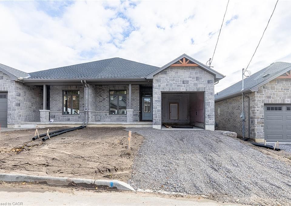 Welcome to 55 Norfolk St., Waterford. Whether starting out or downsizing, this 1266 Sq. Ft. semi-detached home is the perfect option! The perfect answer to having your own yard and your own home, at an affordable price. This is one of 3 remaining available units that are now available on Norfolk St. These bungalow homes make living on one floor easy. From the covered front porch right to the back deck you will have all the comforts that a new home offers. Worried about noise from the attached neighbor?....Don't be! This custom home builder separates the units with a poured concrete wall for your added comfort and security. The open concept home has a large great room with patio doors, adjacent to a dinette which flows right to the kitchen with custom cabinetry/quartz counters, Island with seating, pot lights and more. A large primary bedroom has a walk through closet and 3 piece ensuite with tiled shower. The second bedroom can be used as a bedroom or a den and guests have access to the 4 pc main bath. Main floor laundry/mudroom is adjacent to the garage entry for your convenience. The unfinished basement has large windows and a rough in bath for your future development. Tankless water heater (owned), central air, forced air gas furnace, utility sink, sump pump and fiberglass shingles are just some of the features of this quality home. Construction has started but there is still time for some buyer choices. Call now! (taxes not yet assessed) photos of a similar model for demonstration purposes only