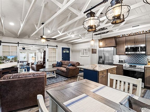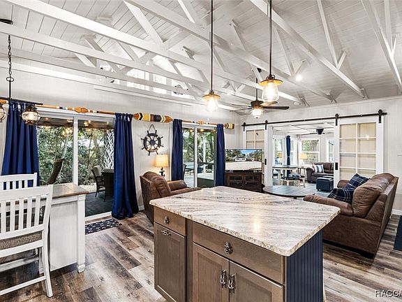 NEVER FLOODED!!! This beautiful property looks like a model home or something straight out of the pages of a design magazine, AND ALL FURNITURE, televisions, pots, pans, linens etc... convey with the sale!!! Move in and keep it for yourself or rent it and let it pay for itself. No stone has been left unturned, from premier granite, stainless steel Frigidaire appliances, huge paver patio with a fire pit overlooking the water, two living areas, multiple eating areas (inside and out). Everything is new since 2021 when the homeowner renovated/remodeled the home, including the kitchen (Refrigerator, stove, microwave/hood, dishwasher), bathrooms, lighting, paver patio with fire pit, laundry room (washer/dryer), roof, hot water heater and more. The enclosed sunroom, with its own mini split system, adds an additional 175 sq ft to enjoy in ultimate comfort. It’s like living in a tropical oasis overlooking the water. Stroll down to your dock and hop onto your boat or kayak, for an enchanting ride out to the scenic Withlacoochee River and directly out to the Gulf of Mexico where you’ll encounter manatee, dolphin, otters and bird species galore. The Withlacoochee and the Gulf offer some of the best fishing in Florida. Located well West of Hwy 19, this home offers direct access to the Gulf, with no bridges. Owner kept a pontoon boat at the dock.