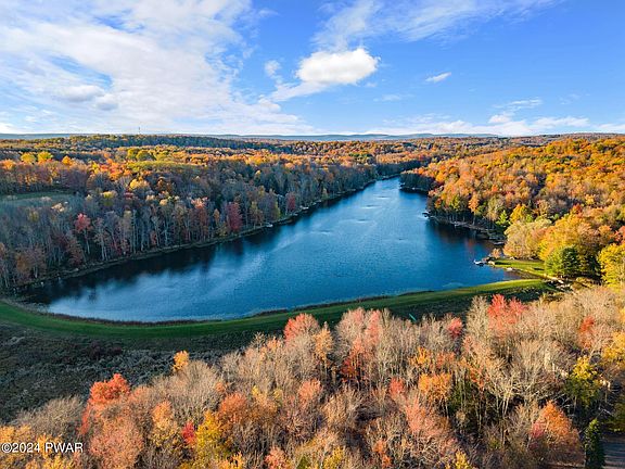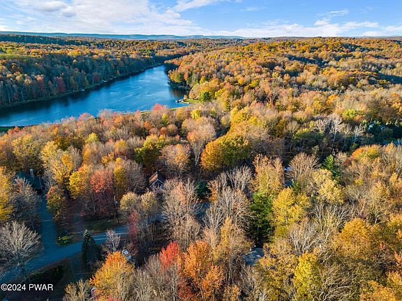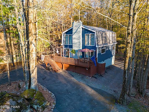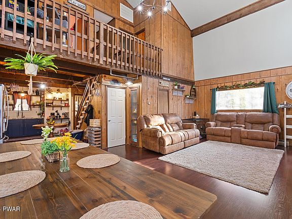 CONTEMPORARY LOG-SIDED CHALET, JUST A MINUTE OR TWO WALK TO THE LAKE IN THE VIBRANT, ALL-SEASON AMENITY-PACKED LAKE COMMUNITY, THE HIDEOUT. Home is set back from the road and offers plenty of comfortable living space including open great room with soaring ceilings, bright light, and fireplace. Large balcony-style loft is upstairs overlooking the great room. Primary bedroom on the lower level offers full bath and walk-in closet. Recent improvements include central air, new roof, and paved circular driveway. The Hideout is rich in recreational amenities including lakes, beaches, pools, ski hill, golf, restaurants, tiki bar, tennis & pickleball courts, walking trail, fitness center, and more!