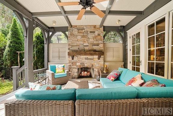 RARE IN TOWN BUNGALOW/COTTAGE in the gated Old Edwards "Satulah Village" just two short blocks off Main Street in Highlands! This charming 3BR, 3.5BA home was thoughtfully constructed facing the private community park which features chairs, a picnic table, and a very nice waterfall complex. Befitting its style and location, the home has upscale rooms and baths featuring the luxury master on main, and two guest suites plus a family/media room upstairs. Multiple walk-in storage areas. An easy walk to restaurants and all the highlights of Highlands, NC. For many, the highlight is the colorful deck and patio ideal for lounging or alfresco meals with its large fireplace, built-in grill, and mesmerizing water feature. The deck includes "Isinglass" curtains which can be rolled down around porch on a chilly evening. This home is a great getaway for one, a couple, or a group of friends.