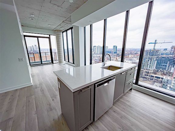 Show Stopper Corner Suite With 10' Floor To Ceiling Windows, Unobstructed Views. Chic Exposed Concrete Ceiling, Modern Flooring, Kitchen W/Breakfast Bar, Expansive Views, Spacious 1 Bed & Separate Den, Approx 650 S.F Upgraded, Balcony Runs The Width Of Bedroom & Living Rm. W/ Gas Bbq Hook Up. Steps To Transit, St. Lawrence Market, Distillery District, Financial Districts, Restaurants, George Brown, Parks And The Lake, Minutes From Dvp. 24 Hr Concierge