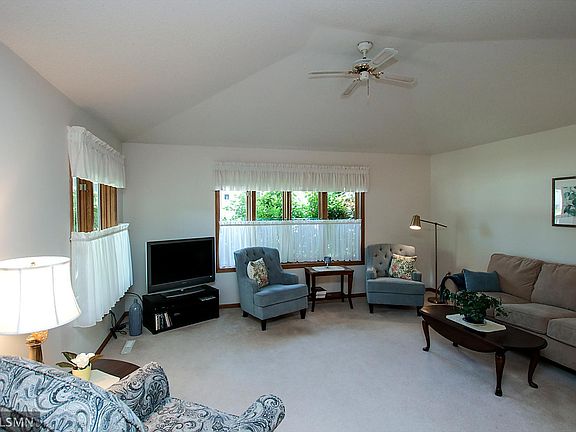 One level living in this well cared for townhouse that features an open floor plan with vaulted ceilings and a center island kitchen. Primary bedroom with bath and walk in closet. Laundry room with sink and cabinets. Second bedroom has built in cabinets. Double attached garage with a small workshop area. Association takes care of snow removal and lawn care.