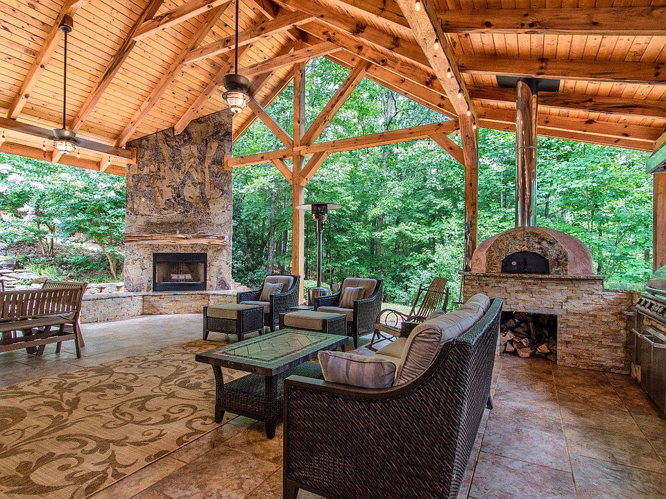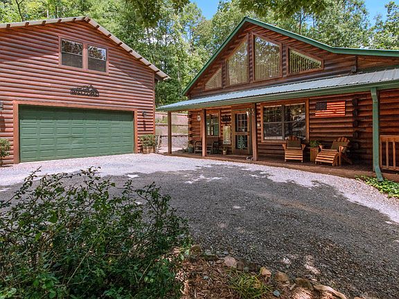 Magazine Cover Worthy! Log chalet w/ 2 master suites on main level w/ additional half bath, fully renovated kitchen/dining room w/ fireplace, laundry area, granite countertops throughout, large living room w/ a second fireplace, & an open loft area. Home is surrounded by a covered porch, large screened porch, & a massive outdoor patio w/ a full kitchen/grill area, pizza oven, & a 3rd fireplace. The 2 car detached garage has an upstairs apartment equipped w/ a heating & air conditioning & a full bathroom. Terraced garden beds are nicely fenced to keep out the many deer that roam the neighborhood. Water feature and mature landscaping. Small branch. RV hookup w/ full electric & septic clean out. Tons of parking. Fiber optic internet. Private well. Vacation rentals allowed! End of road privacy