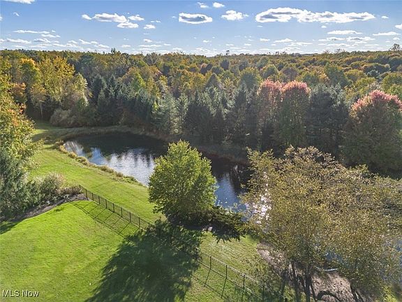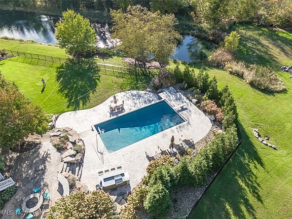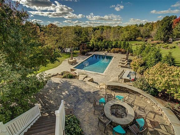 Stunning home in Chagrin Valley Trails. Nestled in a serene cul-de-sac with spectacular views, this remarkable property truly stands out. A striking stacked stone front entrance leads you to exquisite wood arches at the formal dining room and library, enhancing the thoughtfully designed interior. The living room boasts a soaring ceiling, wall of windows, cozy fireplace, and custom built-in bookcases. French doors invite you to the expansive, covered veranda with breathtaking views of colorful treetops, a large serene pond, and luxurious pool surrounded by a magnificent, professionally designed back yard retreat.