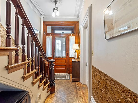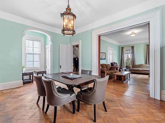 Turn back time as you immerse yourself into history with this stunning 3900 sq ft Queen Ann style home, a true pre-war masterpiece, built in 1872, is rich in character and original craftsmanship. As you approach, the original wooden doors and trim welcome you into a timeless space adorned with exquisite details, including a Victorian-era Lincrusta chair rail lining the hallway and staircase. The first level boasts a spacious living room featuring a decorative hand carved marble fireplace, seamlessly flowing into the formal dining room through preserved original pocket doors. The oversized windows in the living room and bay window in the dining room allow the light to pour in. The spacious eat-in kitchen presents a blank canvas for you to create the kitchen of your dreams. Adjacent to the kitchen, the sunroom—complete with shatterproof windows—can be made into a serene retreat or additional space for the kitchen, while a full bathroom on this level adds to the convenience. The garden level offers a renovated studio apartment with a full bath updated two years ago. This space features ground-level walk-out access and beautifully preserved original long pine tongue-and-groove floors. Just outside the studio is an unfinished area, perfect for your personal vision or storage. On the second level, you'll find three generously sized bedrooms, one with a decorative marble fireplace, and a cozy den. A newly renovated full bathroom includes modern touches like a glass shower door and a state-of-the-art shower panel system. The third level offers three more bedrooms, a fully equipped kitchen, and a recently updated bathroom with NYC skyline views. Throughout the home, you'll find unique touches like parquet floors with intricate inlaid designs, original chandelier medallions, 11 ft. ceilings on the first flr, 9 ft. ceilings on the second floor, and 12" trim throughout the first floor. The home also features double-paned windows, many of which are only five years old, allowing natural light to flood every room. Beneath all floor coverings, including the parquet, lies untouched original pine tongue-and-groove flooring. The property also includes a two-car garage with parking for up to four more vehicles in the driveway, and a fenced-in yard. With its prime location just three blocks from the newly renovated Pershing Field, Central Ave shopping and restaurants, the elementary school just 6 blocks away, and the 123 and 119 bus lines that will have you in Manhattan in under 20 minutes, this home offers convenience and potential, including the option to generate income by renting the garden-level studio as an Airbnb or longer term rental. For added convenience, there's a 2 car garage and parking in the driveway up to 4-5 cars. This home is truly unique and is perfect for those seeking a blend of historical charm and modern convenience.