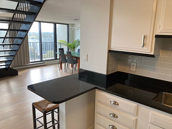 Spectacular North End penthouse condo with stunning city and river views! Enter through secure building access and take the elevator to the 10th floor. A smart lock entry welcomes you into the open-concept living space, filled with natural light from floor-to-ceiling windows. Designer lighting, including Australian and French crystal chandeliers, adds elegance throughout. The modern kitchen features stainless steel appliances (including an oven with air-fry option), granite counters, under-cabinet lighting, Calacatta marble floors, and a tiled backsplash. Industrial-style stairs lead to the 11th-floor bedrooms, both with walk-in closets and built-in cabinetry. The primary bedroom offers a half bath and panoramic Merrimack River views, enhanced by a Czechoslovakian crystal chandelier. The luxurious full bath includes marble walls and floors, a soaking tub, glass-enclosed rain shower, smart toilet with heated seat and bidet, and a floating vanity. Water included; tenant responsible for electricity and cable.