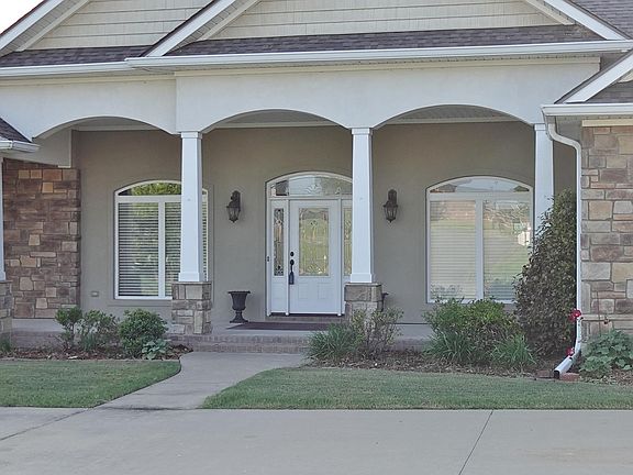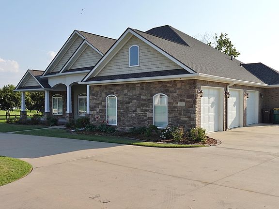 Live on the Arkansas River w/a panoramic view from the minute you walk in the front door! Open concept w/ lg windows to enjoy the tranquil view & spectacular sunsets or walk down to the river on the newly stained (8/24) stairs & dock to fish. Kit boasts of granite countertops & 12' bar, ice maker, double ovens, microwave, elec. smooth top (plumbed for gas). Split BR plan. Lay in bed & view the river in the primary BR w/generous size BA w/his & her L-shaped vanities, walk in closet w/shoe & drawer storage. Lg walk in tiled shower & jetted tub. Access to back porch w/gas fireplace. Secondary BR's each have ensuite sink & toilet w/walk in tiled shower & jetted tub in between. 1 BR has river view w/ outside access. Both have walk in closets. Utility room has sink w/tons of storage & room for refrig/freezer. Crown molding throughout. Remote control gas log fireplace. 3 car garage w/inground storm shelter, stairs for attic access. Tankless water heater. 2 HVAC units (just serviced 8/24) Lg front porch w/hooks for a swing. Back porch plumbed for gas grill. Swing down by riverside. Extra parking w/ circle drive in front.