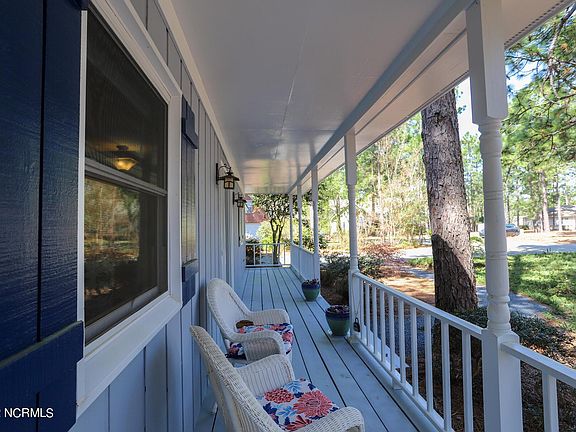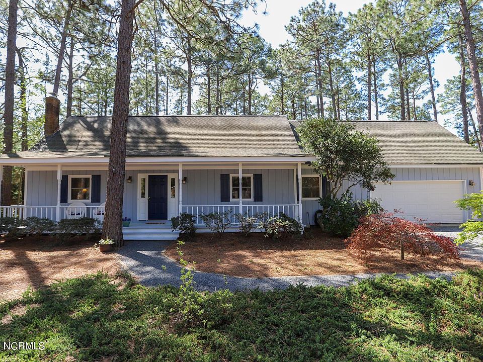Country porch extends across the front of this wonderful 3 bedroom, 2 bath with an updated kitchen.Knotty pine floors grace the living and dining areas. A wood stove on raised brick hearth offers comfort on a chilly night. The dining area is defined by chair rail molding and dish display shelves. The sunroom room opens to blooming azaleas and peaceful views of longleaf pines. Natural light and fresh air stream into this comfortable space. Oversized windows wrap around the sunroom, it makes a great office or yoga studio. The plants love this space and so will the new owners.The kitchen cabinets are shaker style, rich natural cherry, some with rain-glass doors. Don't miss the roll out spice rack, deep drawers and pantry. The kitchen has granite counter tops, updated SS appliances and dual sinks. New stainless refrigerator in 2021 and Bosch DW in 2017. Casual eating area in kitchen is next to the door to the porch and patio. Ceramic tile extends through the kitchen into the laundry. A Central Security control pad is just inside the laundry room door leading to the garage. There are two master bedroom options. On the main level the newly carpeted primary bedroom adjoins the remodeled bath with marble tile, double vanities and a tub/shower. Moving up the attractive wood stairway to the upper bedrooms and bath, one finds the largest bedroom, optional master, which has a closet and a walk-in storage/back up closet. Another walk in closet in the hallway leading to bedroom 3. New carpeting installed in all bedrooms.The upper bath has a tile floor, pedestal sink and tub/shower.The 2 car garage has work benches and half bath. There is a separate (13x13) WORKSHOP and 2 detached metal storage buildings. Large corner lot with fenced back and side yard, flag stone patio and garden plot. Private haven for birds and wildlife. Possible PCC MEMBERSHIP transferable at additional fee of $6,000 to split from another lot owned by seller. Professionally painted inside and out 2019. Roof top slope at back and continuous ridge vent replaced in 2021. Body of roof replaced in 2002. Windows replaced in 2018 except in sunroom, garage and workshop. Central Security system. Aberdeen Exterminating renewal 6.22 Comfort Services maintenance HVAC replaced - one unit in 2000 and other unit in 2017. Possible split of PCC transferrable membership current on another lot, split fee $6,000 plus club transfer fee to the desired level of membership.