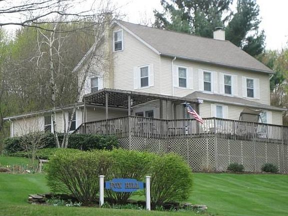 Exceptional property, beautifully maintained on quiet country road. This wonderful family home or fantastic country retreat has wrap around deck, large country kit with plenty of space for family/friends. Spacious bedrooms w/private baths, home office, 4 season sun porch w/fireplace. Guest suite w/separate entrance. Updated Elect/plumbing. 4+ acres w/beautifully landscaped yard, gentle woodlands, solar heated in-ground pool, fitness/game room, & screened gazebo w/hot tub, in excellent neighborhood.